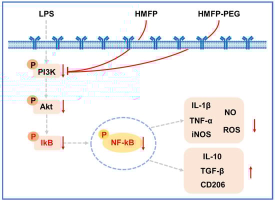 Moreover, the phosphorylation levels of PI3K and Akt were also reduced upon MG132 treatment, indicating that the PI3K/Akt pathway may act in coordination with or downstream of NF-κB in regulating inflammatory responses (Figure 7). These findings support a model in which HMFP and HMFP-PEG exert anti-inflammatory effects through multi-level regulation of interconnected signaling pathways.