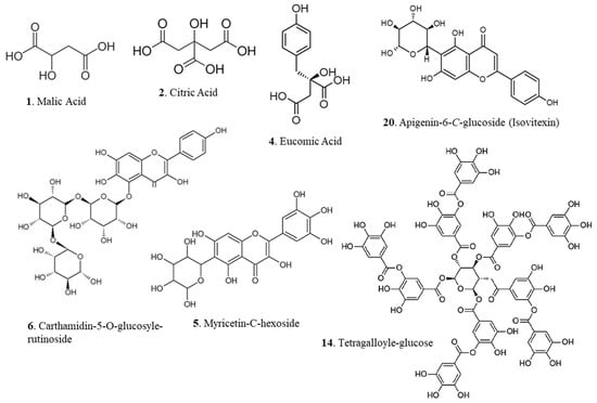 Two organic acids were detected in our extracts (compounds 1 and 2) (Table 2). By comparison of their mass spectra, which are 133 and 191, respectively, these organic metabolites are already identified in the cladodes and fruit of the O. ficus-indica species [13,14].