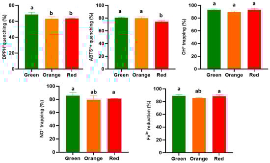 The anti-radical activity through hydrogen transfer (DPPH•-DPPH2+) gave a maximum inhibition percentage of 68.65 ± 2.73% in the extract from the green variety, which was significantly higher than the extracts from the orange and red varieties, which showed lower activities of 63.00 ± 2.68% and 63.60 ± 0.49%, respectively (Figure 3). These rates are lower than those obtained by Alimi et al. [6] for the hydromethanolic fraction of thornless O. ficus-indica roots (78.01 ± 4.11%); higher than the results reported by Avila-Nava et al. [61] for the non-hydrolyzed fraction of the hydromethanolic extract of cladodes of the same species, which indicated a 40% inhibition of this radical; and higher than the inhibition percentage of the ethanol extract from the same species from South Korea in a study conducted by Jeon et al. [62], which yielded a rate of 47.94 ± 0.13%. The IC50 values obtained in the present study showed the same trend as the results of previous studies. Similarly, the green variety proved to be more effective, with a value 695.70 ± 59.30 μg/mL, while the orange and red varieties came in a similar order, with values of 830.37 ± 72.33 and 852.29 ± 28.23 μg/mL, respectively. A significant difference was noted between the latter two varieties and the green variety (Table 3). The latter two concentrations are similar to those reported for the hydromethanolic extracts of the cladodes (867 ± 33 μg/mL) [61]. In contrast, the IC50 value obtained using the extract from the green variety was found to be twice as high as that reported for the cladode extract in a separate study [47]. The results we report in this study are much more relevant than those obtained for the fruit of O. ficus-indica in a South African study, where IC50 values ranging between 40 and 300 mg/mL were noted for methanolic extracts dried using two different methods [43]. Finally, the activities we report here are still lower than that of vitamin C, which is used as an antioxidant standard (5.87 ± 0.26 μg/mL).