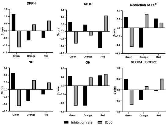 The calculation of the RACI (Relative Antioxidant Capacity Index) allowed us to see, for each antioxidant test, the varieties that have a strong potential against the above-described oxidizing elements, by giving a scores for the inhibition percentage, the EC50, and the IC50. This score varies from −1.5 to 1.5 for each activity in this study, with an overall score at the end describing the variety that presents the highest potential for all tests performed (Figure 4). For most antioxidant tests, the extract from the green variety gave the highest scores and stood out from the other extracts. This is due to the phenolic compound content of the extract, as well as the quality of the molecules present. Moreover, if positive and negative scores are obtained for the IC50 and the activity percentage, respectively, this could be explained by the fact that the extract contains high-quality molecules but at low concentrations.