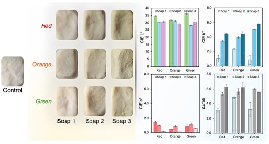Given the importance of the visual appearance of cosmetic products, a colorimetric analysis of the soap formulations containing O. ficus-indica root extracts (red, orange, and green varieties) was performed using the CIELab system (Figure 5). The reported color parameters correspond to the differences (ΔL, Δa*, and Δb*) relative to the control soap, which contained no added extract. This approach highlights the extent of color modification induced by the incorporation of each extract at the three tested concentrations.