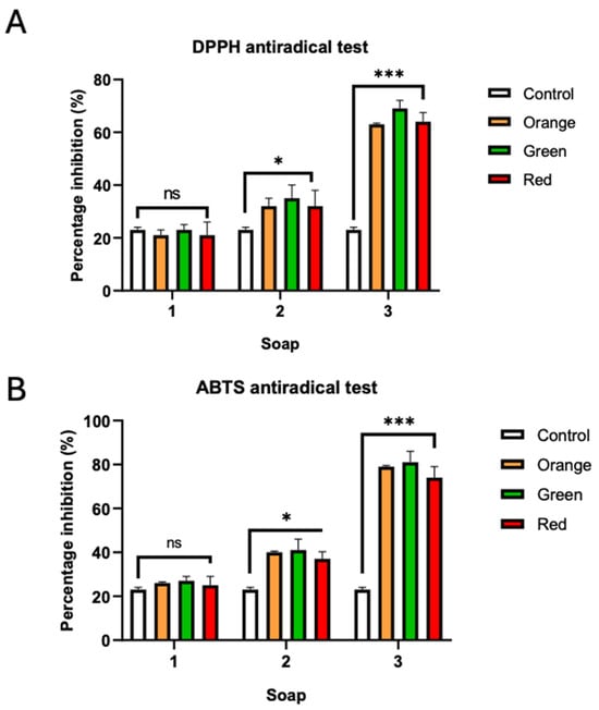 Anti-radical activity of soaps enriched with the O. ficus-indica root phenolic extracts from three varieties (orange, green, and red). (A): DPPH antiradical test; (B): ABTS antiradical test. ns: non-significant difference p > 0.05; *: significant difference at p < 0.05; ***: significant difference at p < 0.001.