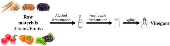 Vinegar, a popular food condiment, has a history of more than 3000 years [1]. It is produced from various raw materials including fruits (e.g., apples, persimmons, grapes, plums, and cherries) and cereals (e.g., rice, sorghum, barley, malt, wheat, corn, rye, and oats) [2,3,4]. Owing to the different raw materials, fermented vinegars have different flavors and nutrients [2,5].