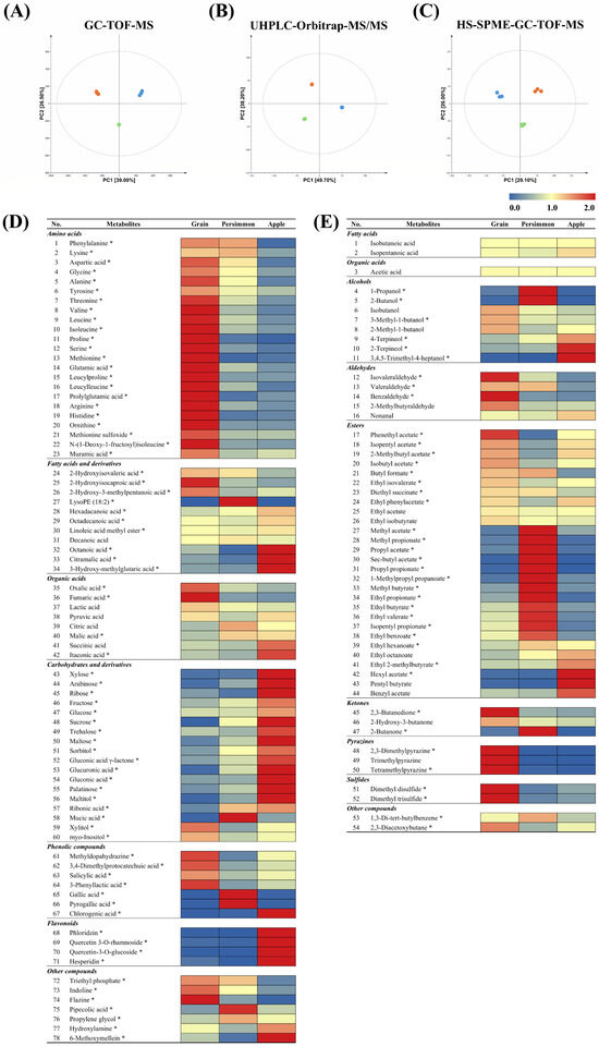 Principal component analysis (PCA) score plot of GV (●), PV (●), and AV (●) based on the GC-TOF-MS (A), UHPLC-Orbitrap-MS/MS (B), and HS-SPME-GC-TOF-MS (C) analysis datasets. All experiments were performed in triplicate. Heatmap of non-volatile and volatile metabolites based on three types of vinegars using GC-TOF-MS and UHPLC-Orbitrap-MS/MS (D) and HS-SPME-GC-TOF-MS (E) analyses, respectively. The heatmap based on the PLS-DA model highlights the relative abundance of observed metabolites. * The asterisks indicate the significant difference (VIP score > 0.7, p-value < 0.05).
