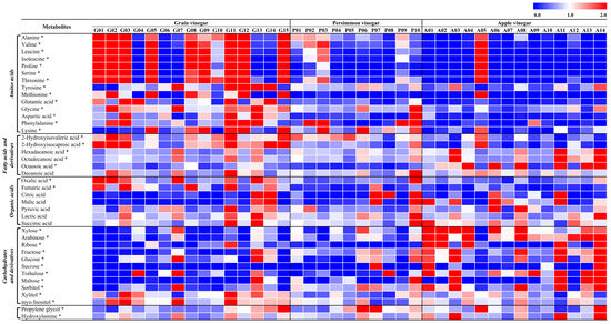 To investigate the metabolite differences in each vinegar product manufactured by different producers, we performed metabolite analysis using 39 vinegar products using GC-TOF-MS and multivariate statistical analysis. Similar to the PLS-DA obtained from the pooled QC samples, the resultant partial least squares discriminant analysis (PLS-DA) using each product showed a separating pattern of the three vinegars, although each product fermented from the same main ingredient was scattered (Figure S3). Forty metabolites were tentatively identified, and their relative abundances are shown in Figure 4. The relative content of each metabolite was notably different depending on the vinegar product, even for the same type of vinegar. For example, G04, G06, G07, and G10 had relatively lower content of most detected amino acids than other GVs, while G13 and G14 contained comparatively lower amounts of most of amino acids but more glutamic acid, glycine, aspartic acid, and phenylalanine. Among PVs, P10 had different metabolite compositions, abundant fatty acids, organic acids, and carbohydrates compared to other PVs. Among the AVs, A05 showed a markedly distinct composition, containing higher amounts of amino acids but fewer carbohydrates than the other apple vinegars. Due to the variation in metabolites across individuals, the tastes and nutritional value of each product can differ, despite products belonging to the same vinegar category. We assume that the variation among individual products is caused by differences in ingredients, fermentation microorganisms, and fermentation conditions (e.g., temperature, duration).