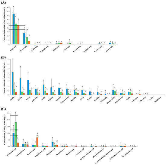 Quantification of organic acids (A), amino acids (B), and fatty acids (C) in GV (●), PV (●), and AV (●). Significant differences between groups are indicated by different letters above the bars based on Duncan’s multiple-range test (p-value < 0.05).