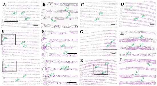 Effects of H2O2 exposure on gill morphology (HE-stained): (A,B) control; (C) 6 mmol/L + 24 h; (D) 6 mmol/L + 72 h; (E,F) 12 mmol/L + 24 h; (G,H) 12 mmol/L + 72 h; (I,J) 15 mmol/L + 24 h; (K,L) 15 mmol/L + 72 h. Gl, gill lumen; Se, septum; Hc, haemolymph cell; Hi, haemolymph cell increase; Ft: gill filament thickening. The boxed areas in (A,E,G,I,K) are magnified in (B,F,H,J,L), respectively. Scale bar = 50 µm.