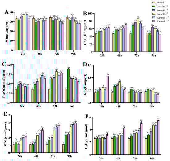 Effects of H2O2 exposure on antioxidant parameters in gills. (A) SOD; (B) CAT; (C) T-AOC; (D) GPx; (E) MDA; (F) H2O2. Distinct lowercase letters indicate significant differences at the same time point (p < 0.05), while distinct uppercase letters indicate significant differences across different time points within the same treatment group (p < 0.05).