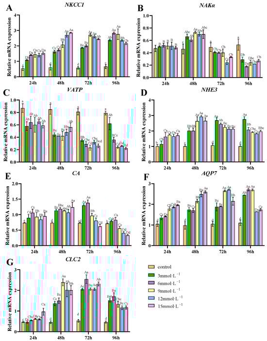 Effects of H2O2 exposure on the transcription of ion transport-related genes in gills. (A) NKCC1; (B) NAKα; (C) VATP; (D) NHE3; (E) CA; (F) AQP7; (G) CLC2. Distinct lowercase letters indicate significant differences at the same time point (p < 0.05), while distinct uppercase letters indicate significant differences across different time points within the same treatment group (p < 0.05).