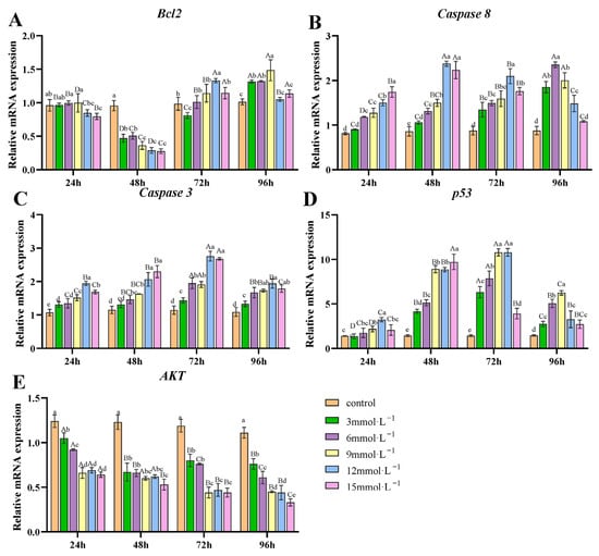 Under H2O2 exposure, Bcl2 transcription was significantly inhibited at 48 h, showing values significantly lower than those of the control group (p < 0.05). However, at 72 and 96 h, there was a significant increase compared to 48 h (p < 0.05, Figure 4A). Caspase-8 and Caspase-3 transcription was significantly upregulated at all H2O2 concentrations and time points compared to the control (p < 0.05, Figure 4B,C). For Caspase-8, the 3, 6, and 9 mmol/L treatments showed a progressive increase in transcription over time, while in the 12 and 15 mmol/L groups, it reached its maximum at 48 h. For Caspase-3, its transcription peaked at 72 h. Similarly, the transcription of p53 was significantly higher than the control (p < 0.05), reaching its maximum at 72 h (Figure 4D). The AKT transcription decreased significantly over time (p <0.05), with only a slight increase in the 3 mmol/L treatment group at 72 h (Figure 4E)