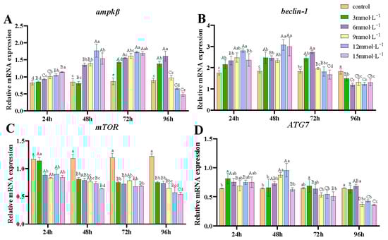 Effects of H2O2 exposure on the transcription of autophagy-related genes in gills. (A) ampkβ; (B) beclin-1; (C) mTOR; (D) ATG7. Distinct lowercase letters indicate significant differences at the same time point (p < 0.05), while distinct uppercase letters indicate significant differences across different time points within the same treatment group (p < 0.05).