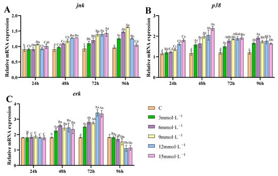 After H2O2 exposure, mRNA levels of jnk exhibited a gradual increase from 48 to 96 h across all exposure concentrations. Although a slight decrease was observed in the 12 and 15 mmol/L treatment groups, levels remained markedly higher than the control group, with statistical significance (p < 0.05, Figure 6A). During the 96 h exposure, the transcription of p38 exhibited a continuous increasing trend in the 3 and 6 mmol/L groups, with significant upregulation observed from 48 to 96 h. Meanwhile, p38 transcription was markedly upregulated in the 9, 12, and 15 mmol/L groups after 24 h of H2O2 exposure, although it showed a declining trend at 96 h in the high concentration H2O2 groups (p < 0.05, Figure 6B). The transcription of erk was upregulated at 48 and 72 h under H2O2 exposure compared to the control. However, at 96 h, it decreased, showing levels lower than the control after 9, 12, and 15 mmol/L H2O2 exposures (p < 0.05, Figure 6C).