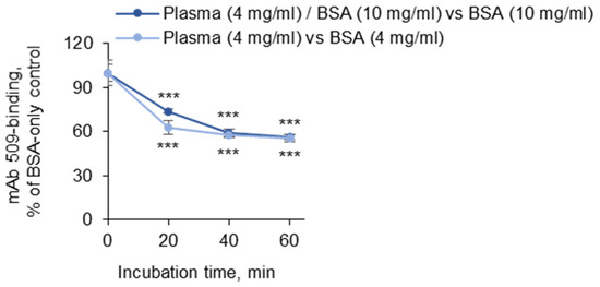 A comparison of two BSA concentrations for determination of the masking effect. Coating of the plates with OxLDL and blocking with 3% fish gelatin were performed according to the standard procedures. After washing, the wells were filled with 50 µL of PBSE/BSA (10 mg/mL). Then, 50 µL aliquots of plasma diluted 1:10 (2-fold-concentrated as compared to that in the standard procedure) were added to the 50 µL already present in the plate, thus resulting in final dilution of 1:20. Plasma was added at time 0 and after 20, 40, and 60 min, thus resulting in incubation times of 60, 40, 20, and 0 min. The experiment was performed under four conditions within the same plate: (a) BSA (10 mg/mL); (b) BSA (10 mg/mL) + plasma (1:20); (c) BSA (4 mg/mL); and (d) plasma (1:20), with no BSA. Because the pooled plasma contained 80 mg/mL of protein, the total protein concentrations in samples (c) and (d) were identical. After the last addition of plasma at 60 min, the plate was immediately washed and treated with mAb 509, the anti-mouse IgM conjugate, and substrates according to the standard conditions described in the “Methods” section. The two curves represent the ratios of samples (b) to (a) and (d) to (c) at the indicated time points. Note that different BSA concentrations did not significantly change the kinetics or maximal values of the masking activity. Statistical significance is shown as compared to time point 0. *** p ≤ 0.001.