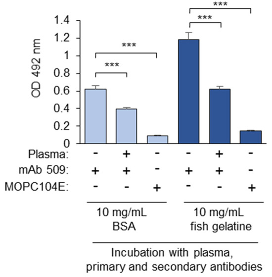 A comparison of BSA and fish gelatin as the blocking proteins in the masking assay. Coating the plates with OxLDL and blocking with fish gelatin (30 mg/mL) were performed according to the standard procedures. Further incubations with plasma, mAb 509, MOPC104E, and the anti-mouse IgM conjugate were performed either in the presence of BSA (10 mg/mL) or fish gelatin (10 mg/mL). *** p ≤ 0.001.