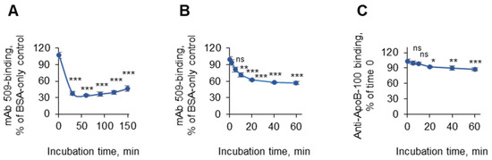 The time kinetics of the masking effect. Coating of the plates with OxLDL and blocking with fish gelatin (30 mg/mL) were performed according to the standard procedures. After washing, the wells were filled with 50 µL of PBSE/BSA (10 mg/mL). (A) Plasma was diluted 1:10 (2-fold-concentrated as compared to the standard procedure) in the same solution and stored on ice. Then, 50 µL aliquots of diluted plasma were added at different times to the 50 µL already present in each well to obtain incubation times of 150, 120, 90, 60, 30, and 0 min at 1:20 plasma dilution. In panel (B), all incubations were performed in the presence of fish gelatin instead of BSA, and plasma incubation times of 0, 5, 10, 20, 40, and 60 min were used. At the end of incubation, all wells were simultaneously washed and treated with mAb 509, the anti-mouse IgM conjugate, and the substrates according to the standard conditions described in the “Methods” section. In panel (C), the OxLDL-coated wells were incubated for different times with plasma (1:20) in PBSE/BSA (10 mg/mL). The ELISA in (C) was performed using an anti-apoB mAb (Santa Cruz). Statistical significance is shown as compared to time point 0. ns—non-significant, * p ≤ 0.05, ** p ≤ 0.01, and *** p ≤ 0.001.