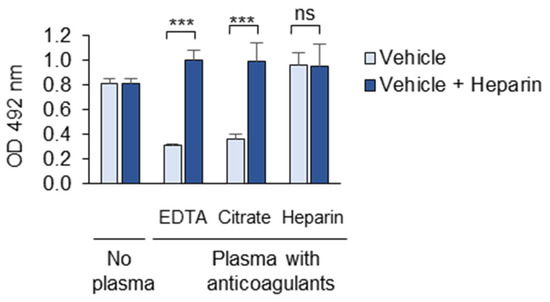 We further compared the masking activity of plasma collected from the same donor in different anticoagulants, namely EDTA, citrate, and heparin. Such triple samples were obtained from three donors and combined to make EDTA-, citrate- and heparin-anticoagulated pools. The plasma samples anticoagulated with the divalent ion chelators EDTA and citrate were active and demonstrated comparable masking effects (Figure 6). In contrast, the heparin-anticoagulated plasma showed no masking activity (Figure 6). The addition of heparin (20 µg/mL) to the EDTA- and citrate-anticoagulated plasma completely reversed the masking effect.