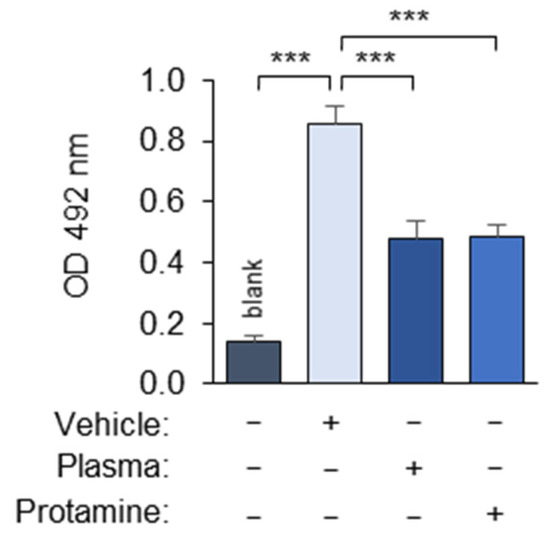 Protamine demonstrates masking activity. The experiment was performed according to the standard procedure described in the “Methods” section in the absence or presence of polycation protamine, which was added during the incubation of OxLDL with the plasma. Blank values were obtained by omitting mAb 509. PBSE/BSA (10 mg/mL) was used as a vehicle. *** p ≤ 0.001.