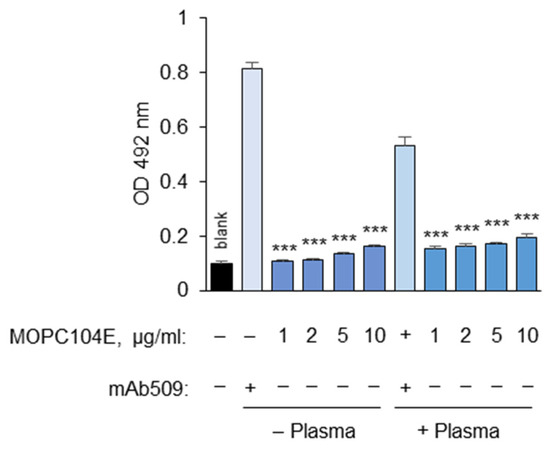 The determination of non-specific binding using the mouse IgM control mAb MOPC104E. mAb 509 was used at 10 µg/mL. The left column presents the no-first-antibody blank value. It can be seen that IgM has some affinity with OxLDL, and the resulting OD492 values tend to be higher than those for the no-first-antibody control, especially after pretreatment of the OxLDL with plasma. The data suggest that MOPC104E may be a better control in the masking assay as compared to the no-first-antibody control. Statistical significance is shown as compared to the mAb 509 values either with or without plasma pretreatment. *** p ≤ 0.001.