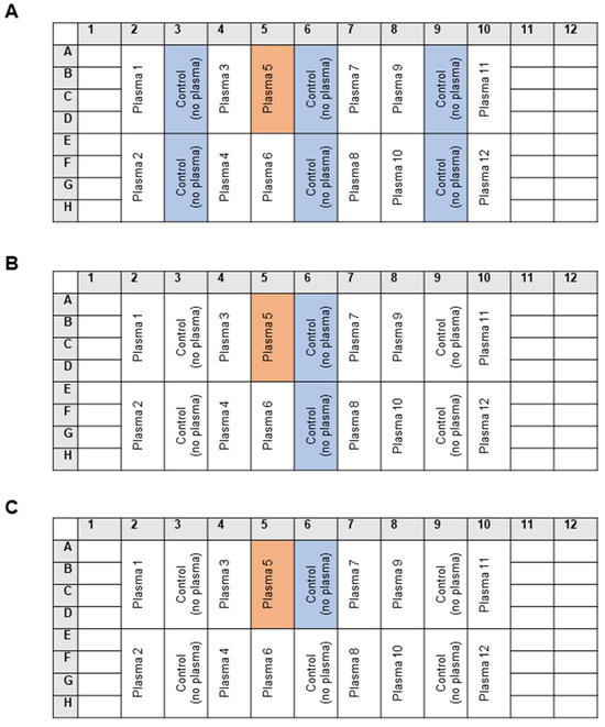 The assay was successfully performed in both 96- and 384-well plates. Pipetting of the reagents was performed using multisteppers, single- and multichannel manual or electronic pipettes, and a pipetting robot. All of the pipetting steps produced satisfactory results, with CV values between 2 and 5%. The most common type of experimental bias in immune assays is the intra-plate gradient of the signal. In order to estimate the impact of this source of error, the maximal binding of mAb 509 (i.e., the control samples incubated with plasma-free PBSE/BSA (10 mg/mL)) was determined at several positions (columns 3, 6, and 9) in each 96-well plate (Figure 13). The individual plasma masking capacity was calculated using one of the three approaches presented in Figure 13, namely normalization to (A) the mean of all 24 control wells positioned in columns 3, 6, and 9; (B) the mean of 8 control wells in the column adjacent to an individual sample; or (C) the mean of 4 control wells in the direct vicinity of the sample wells. In order to compare the performance of these methods, we used the results of an OSE-masking ELISA study (results to be published elsewhere) that included samples from 138 subjects that were analyzed in 12 plates on three different days. Each plate included a freshly thawed aliquot of the same pooled plasma sample. We used these pooled plasma values to estimate the statistical variation in the assay. First, the mean OD value of the pooled plasma sample was calculated within each plate. Next, the mean OD values of the no-plasma controls (maximal binding) was calculated using the three approaches described above (24, 8, or 4 control wells). Further, the mean OD value of the pooled plasma was divided by each of the three no-plasma control values, thus producing three masking capacity values for each plate. Finally, the mean masking capacity and CV values were calculated for pooled plasma samples from 12 plates. The data (Table 1) show that the mean values determined using these three methods of normalization were close to each other, thus confirming the lack of intra-plate gradients. The inter-plate CV was close to 10%, which is generally regarded as acceptable.