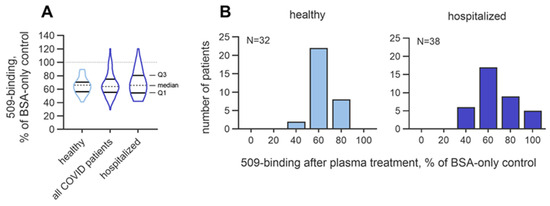 Characterizing inter-individual variation is a crucial aspect of assay development. The OSE-masking activity (expressed as the % of the no-plasma control values) in the healthy subjects (n = 32) varied from 41.2 to 89.5%. In addition, assuming that the activity may be influenced by disease, we analyzed the variation in a cohort of SARS-CoV-2-seropositive patients with different disease severities (n = 98) and in a subgroup of patients that were hospitalized (n = 38), of whom 15 had acute respiratory distress syndrome and 9 had sepsis. The OSE-masking activity in the mixed COVID-19 cohort varied from 29.2 to 120%, and in the hospitalized group, it varied from 42.1 to 120%. Although the median values in the three groups were close to each other (66.1, 64.1, and 65.8%, respectively; Figure 14A), it was found that the hospitalized group contained more patients with masking values below 50% and above 80% as compared to these numbers of seronegative subjects (Figure 14B), which pointed to the higher dispersion of the masking activity in the group with severe disease. The interquartile ranges, which quantitatively described the variation within groups, were 14% in the seronegative probands, 19.6% in the combined COVID-19 group, and 26.1% in the hospitalized COVID-19 patients. The trend of increased variation may reflect the heterogeneity of the disease severity and treatment in hospitalized patients. To summarize, these data suggest that acute pathology can influence the variation in masking activity.