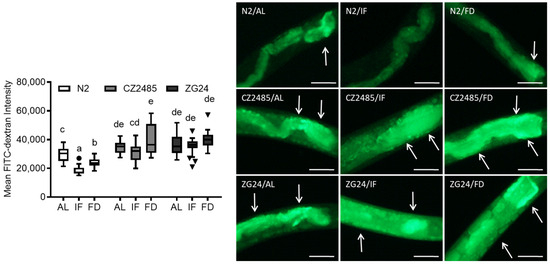 - McGhee, J.D. The C. elegans intestine. In WormBook: The Online Review of C. elegans Biology [Internet]; WormBook: Pasadena, CA, USA, 2007. [Google Scholar]