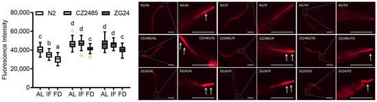 3.3. GFP-OP50 Colonization Reveals Impaired Gut Defense in AHR Mutants Under Fasting