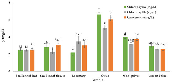 Chlorophyll a, chlorophyll b and total carotenoids in plant material. a–j Different lowercase superscript letters within a column denote significant differences (p > 0.05) between values obtained for different plant materials. Results are given as mean ± standard deviation.