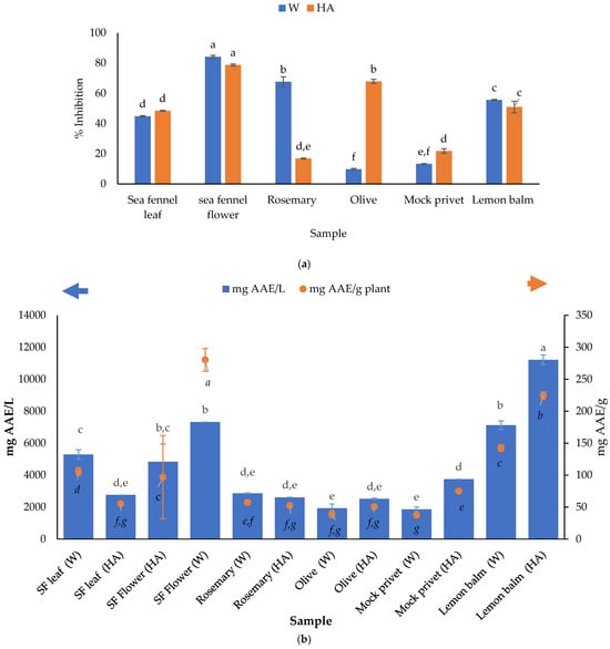 Antioxidant activity of water (W) and hydroalcoholic (HA) extracts determined using (a) DPPH method; (b) FRAP method. SF—sea fennel. a–g Different letters denote significant differences (p > 0.05) between values obtained for different plant materials. Results are given as mean ± standard deviation, and statistical analysis were performed separately for each series—one for mg AAE/L (given above) and one for mg AAE/g plant (given below).