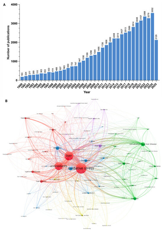 Visualization of a bibliometric analysis examining the relationship between oxidative stress and liver disease. (A) Annual number of English-language publications from 1990 to 2025. (B) Network map of co-occurring keywords, highlighting major research themes. Bibliographic data retrieved from the PubMed database on 8 July 2025.