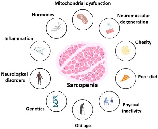 Multifactorial contributors to sarcopenia. Sarcopenia results from interconnected molecular and systemic factors, including mitochondrial dysfunction, hormonal dysregulation, chronic inflammation, neuromuscular and neurological impairment, as well as lifestyle-related contributors such as poor diet, obesity, and physical inactivity. Age-related decline and genetic predisposition further exacerbate muscle loss and functional impairment.