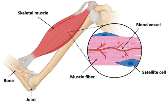 Skeletal muscle is a highly organized and adaptable tissue composed of multinucleated myofibers, connective tissue, blood vessels, and resident stem and immune cells (Figure 2). Each myofiber is encased in a basal lamina and surrounded by a specialized niche containing satellite cells—the adult muscle stem cells that orchestrate repair and regeneration [,,,,,]. These quiescent cells reside beneath the basal lamina and are activated in response to stress, injury, or exercise. Satellite cells are characterized by the expression of transcription factor Pax7 (paired box protein 7) and, upon activation, initiate a myogenic program involving myogenic factor 5 (Myf5) and myogenic differentiation 1 (MyoD) [,,,,,,]. They proliferate, differentiate into myoblasts, and ultimately fuse with existing fibers or form new fibers to restore tissue integrity. A subset of activated satellite cells self-renews to maintain the stem cell pool. This process is tightly regulated by both intrinsic factors (e.g., epigenetic status and cell polarity) and extrinsic cues from the extracellular matrix (ECM), immune cells, and systemic factors such as hormones and cytokines [,,,,,,].