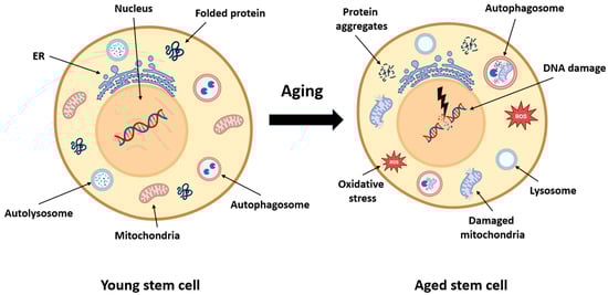 Cellular consequences of aging in muscle stem cells. This schematic compares a young muscle stem cell with an aged stem cell, highlighting the intracellular hallmarks of aging. In youthful cells, mitochondria, protein folding, and autophagy pathways are intact, enabling effective energy production, repair, and proteostasis. With aging, stem cells accumulate protein aggregates, exhibit impaired autophagy, and suffer mitochondrial damage. These changes lead to oxidative stress (↑ Reactive Oxygen Species ROS), DNA damage, and reduced regenerative capacity. Dysfunctional lysosomes and endoplasmic reticulum contribute to further metabolic decline. Collectively, these disruptions impair satellite cell homeostasis, contributing to sarcopenia and diminished muscle repair.