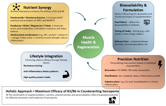 The biological effects of nicotinamide and pyridoxine do not occur in isolation; rather, they are modulated by their interactions with other nutrients and lifestyle factors. These interactions can amplify their effects on muscle metabolism, stem cell function, and systemic health, especially when incorporated into personalized nutrition strategies [,,]. A growing body of research supports the concept of nutrient synergy in muscle health. For instance, combining nicotinamide with resistance exercise enhances NAD+ biosynthesis and mitochondrial adaptations. Nicotinamide supplementation increases SIRT1 activity, while exercise-induced NAMPT expression synergistically boosts NAD+ salvage [,,,]. Similarly, pyridoxine interacts with branched-chain amino acids and micronutrients like magnesium and folate to improve amino acid metabolism, methylation reactions, and redox balance. Multinutrient supplementation trials in frail elderly populations show that B6, when combined with adequate protein, vitamin D, and omega-3 fatty acids, is associated with improved muscle strength, reduced inflammation, and slower lean mass loss [,,,]. This suggests that co-formulation and dietary pattern design are key to maximizing efficacy. Moreover, the food matrix and timing of intake influence the bioavailability and metabolic fate of both B3 and B6, indicating the importance of holistic nutritional planning. The development of precision nutrition approaches offers new opportunities for tailoring interventions based on individual nutritional phenotypes and risk profiles. Biomarkers such as plasma PLP, urinary NMN, CRP, and body composition indices can guide personalized plans [,,,]. Stratifying patients by sex, metabolic status, and inflammatory burden may enhance the effectiveness of B3/B6 supplementation. Additionally, elderly individuals with chronic conditions or post-hospitalization recovery may benefit from customized combinations of dietary and lifestyle interventions. Integrating vitamin B3 and B6 supplementation with resistance training, high-quality protein intake, and anti-inflammatory dietary patterns could restore regenerative capacity and improve quality of life. Altogether, nutrient interactions and personalized nutrition represent a promising direction for harnessing the full potential of nicotinamide and pyridoxine in combating sarcopenia. This multifaceted strategy leverages dietary complexity, metabolic individuality, and molecular biology to support muscle health in aging populations [,,,,,] (Figure 5).