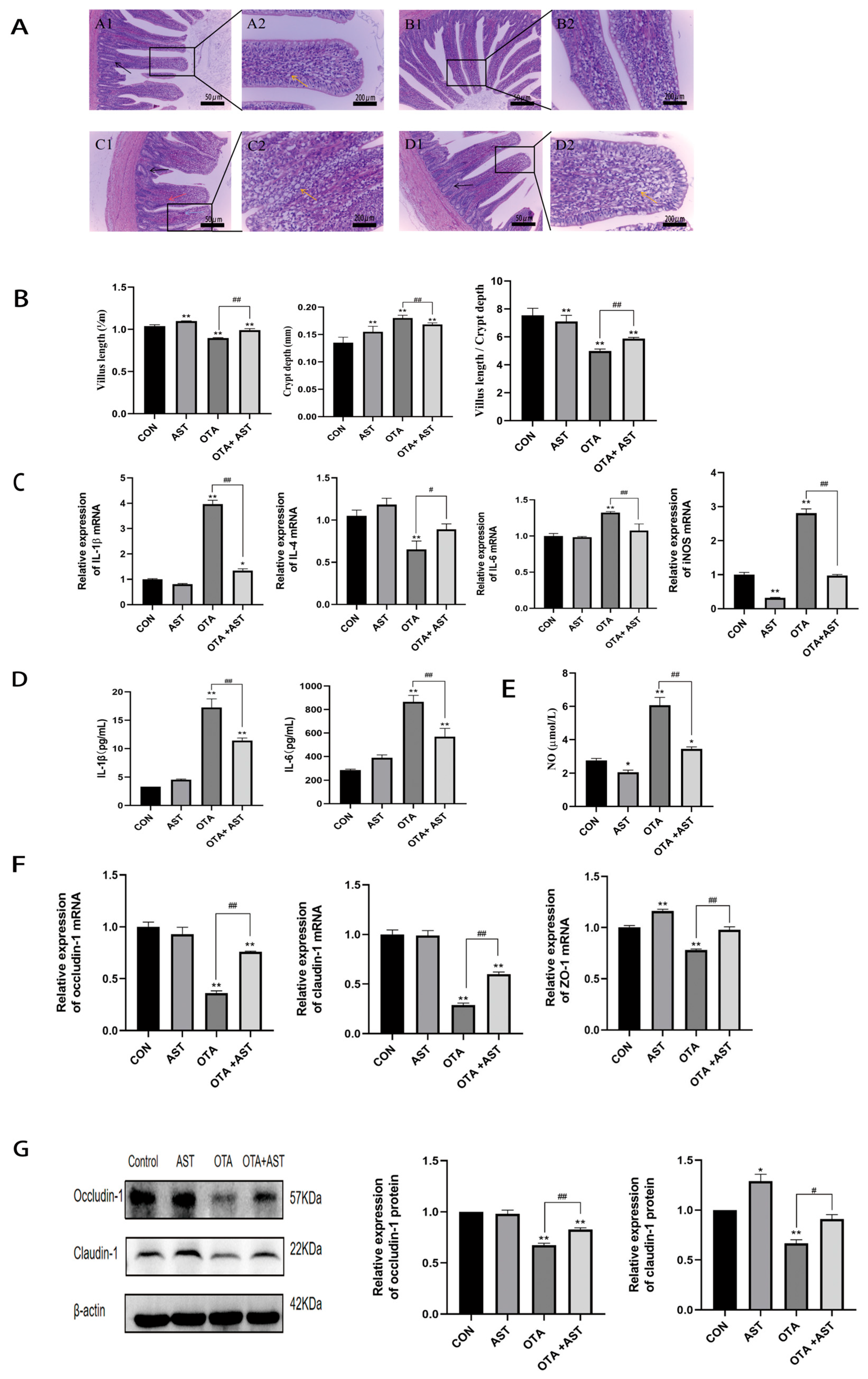 3.2. AST Alleviated the Inflammatory Damage Caused by OTA to the Jejunum of Chickens