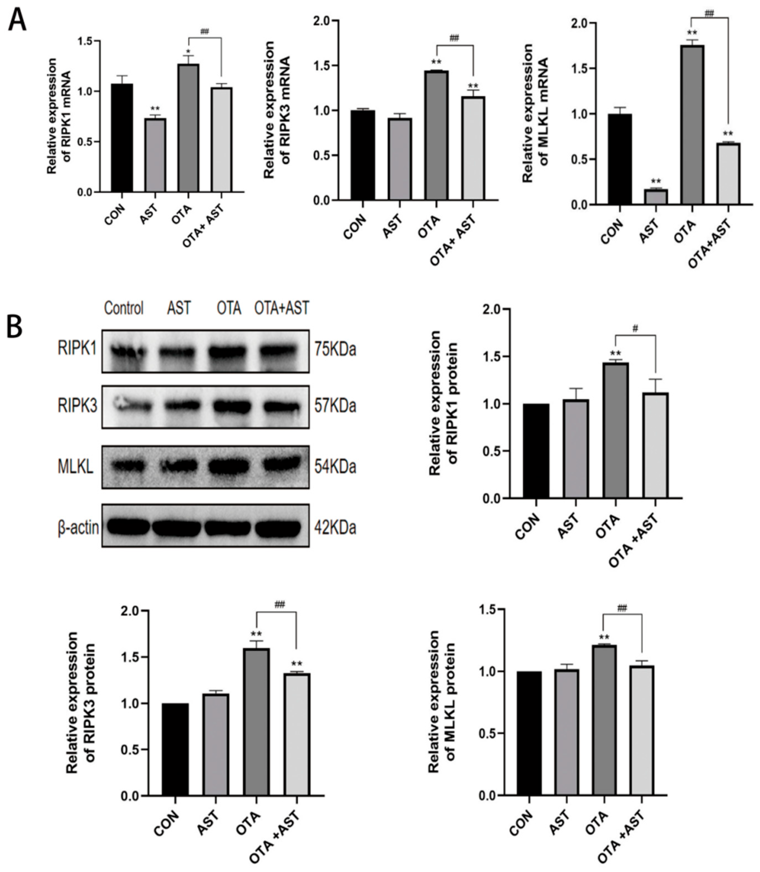 3.3. AST Alleviated OTA-Induced Necroptosis in the Chicken Jejunum by Modulating the RIPK1/RIPK3/MLKL Signaling Pathway