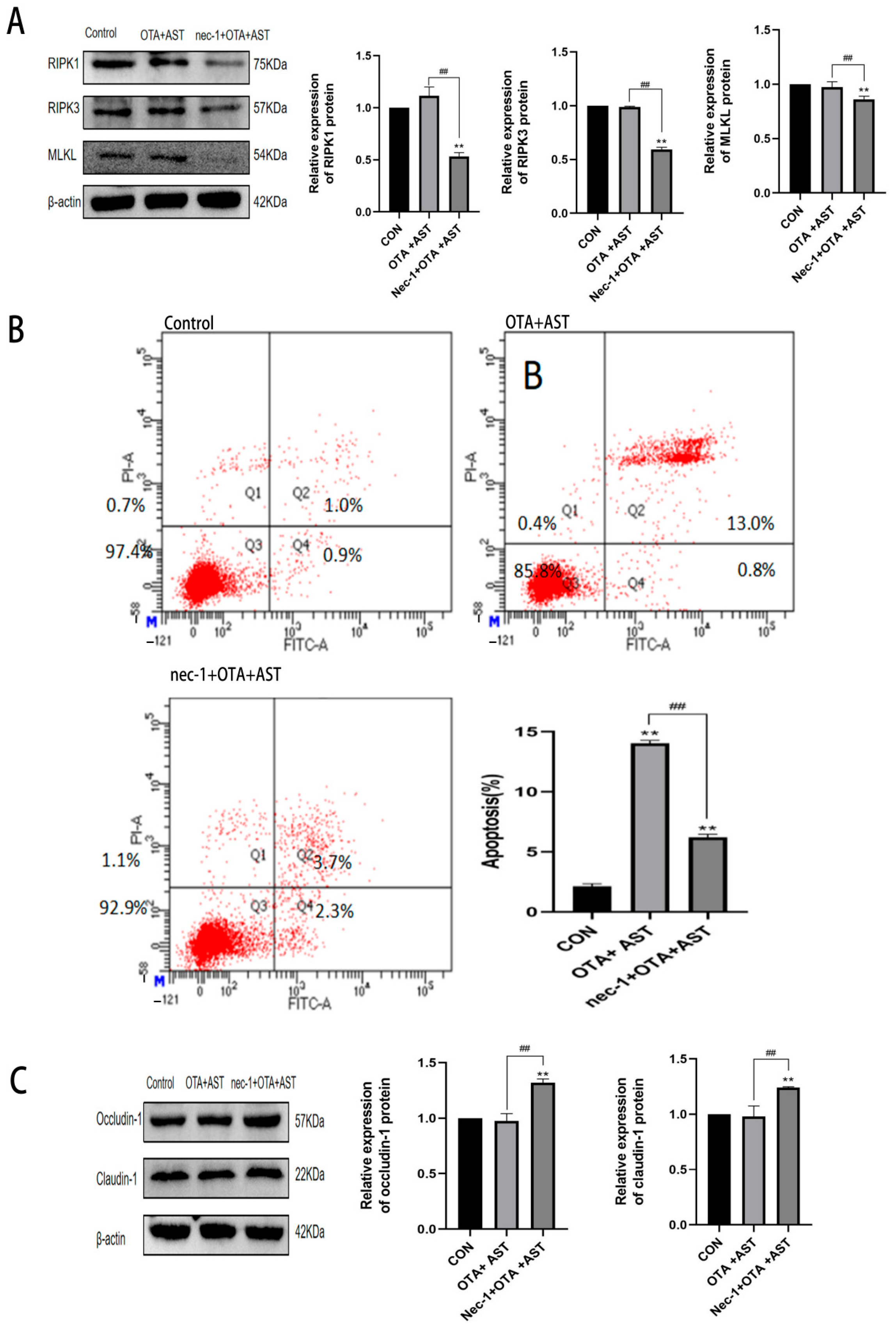 3.6. Nec-1 Promoted the Antagonistic Effect of AST on OTA-Induced Necroptosis and Injury
