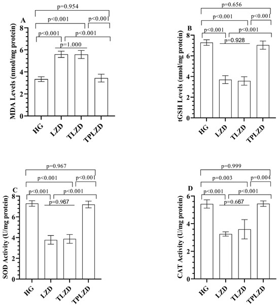 (A) MDA; (B) tGSH; (C) SOD; and (D) CAT levels in liver tissues of experimental groups. Bars indicate mean ± standard deviation, n = 6 (per group). p < 0.05 was determined as statistical significance. One-way ANOVA followed by Tukey’s post hoc test was used for statistical analysis. Exact p-values above the bars represent significant pairwise comparisons among HG, LZD, TLZD, and TPLZD groups. Providing exact p-values enhances interpretability and ensures transparency in statistical reporting, especially when multiple comparisons are involved. MDA, malondialdehyde; tGSH, total glutathione; SOD, superoxide dismutase; CAT, catalase; HG, healthy group; LZD, linezolid group; TLZD, thiamine + linezolid group; TPLZD, TPP + linezolid group.