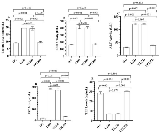 (A) Lactate; (B) LDH; (C) ALT; (D) AST; and (E) TPP levels in serum of experimental groups. Bars indicate mean ± standard deviation, n = 6 (per group). p < 0.05 was determined as statistical significance. One-way ANOVA followed by Tukey’s post hoc test was used for statistical analysis. Exact p-values above the bars represent significant pairwise comparisons among HG, LZD, TLZD, and TPLZD groups. Providing exact p-values enhances interpretability and ensures transparency in statistical reporting, especially when multiple comparisons are involved. LDH, lactate dehydrogenase; ALT, alanine aminotransferase; AST, aspartate aminotransferase; TPP, thiamine pyrophosphate; HG, healthy group; LZD, linezolid group; TLZD, thiamine + linezolid group; TPLZD, TPP + linezolid group.