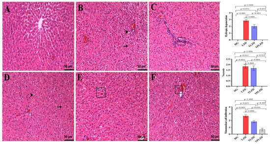 Histopathological appearance of liver tissues belonging to the (A) HG; (B,C) LZD; (D) TLZD; and (E,F) TPLZD groups (H&E). (A) HG group. Normal histological appearance in liver tissue. (B) LZD group. Severe hydropic degeneration (arrowhead) and moderate necrosis (arrow) in liver tissue. (C) LZD group. Severe mononuclear cell infiltration (square) in the periportal areas of the liver tissue. (D) TLZD group. Moderate hydropic degeneration (arrowhead) and moderate necrosis (arrow) appearance in liver tissue. (E) TLZD group. Appearance of moderate mononuclear cell infiltration (square) in the periportal areas of the liver tissue. (F) TPLZD group. Appearance of mild mononuclear cell infiltration (square) in the periportal areas of the liver tissue. Bars indicate mean ± standard deviation, n = 6 (per group). The Mann–Whitney U test was used in the analysis of histopathological semiquantitative data. p < 0.05 was determined as statistical significance. HG, healthy group; LZD, linezolid group; TLZD, thiamine + linezolid group; TPLZD, TPP + linezolid group. Microscopic magnification: 20×.
