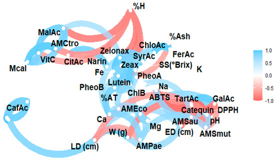 Similarly, citric acid showed a negative correlation with ash and vitamin C, suggesting a possible antagonism between organic acidity and mineral accumulation, which affects the stability of ascorbic acid. Similarly, malic acid was found to correlate negatively with both moisture and citric acid, suggesting that these acids are oppositely regulated during fruit ripening.