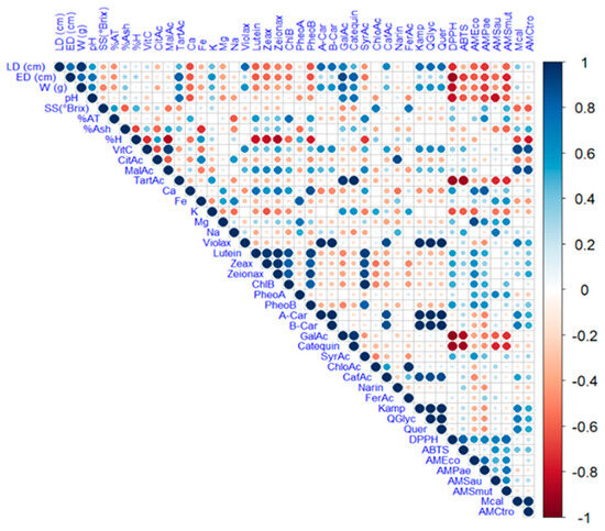 Pearson correlation analysis of the studied variables. Note: violaxanthin (Violax), lutein (Lutein), zeaxanthin (Zeax), zeionaxanthin (Zeioax), chlorophyll b (ChlB), pheophytin a (PheoA), pheophytin b (PheoB), chlorophyll a (ChlA), α-carotene (A-Car), β-carotene (B-Car), vitamin C (VitC), citric acid (CitAc), malic acid (MalAc), tartaric acid (TarAc), gallic acid (GalAc), syringic acid (SyrAc), chlorogenic acid (ChloAc), caffeic acid (CafAc), naringenin (Narin), ferulic acid (FerAc), kaempferol (Kamp), quercetin glycoside (QGlyc), quercetin (Quer), calcium (Ca), iron (Fe), potassium (K), magnesium (Mg), sodium (Na), antioxidant activity by ABTS (ABTS), antioxidant activity by DPPH (DPPH), antimicrobial activity against S. aureus (AMSau), antimicrobial activity against E. coli (AMEco), antimicrobial activity against P. aeruginosa (AMPae), antimicrobial activity against C. albicans (Mcal), antimicrobial activity against C. tropicalis (AMCtro).