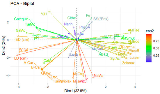 Principal component analysis of the studied variables. Note: violaxanthin (Violax), lutein (Lutein), zeaxanthin (Zeax), zeionaxanthin (Zeioax), chlorophyll b (ChlB), pheophytin a (PheoA), pheophytin b (PheoB), chlorophyll a (ChlA), α-carotene (A-Car), β-carotene (B-Car), vitamin C (VitC), citric acid (CitAc), malic acid (MalAc), tartaric acid (TarAc), gallic acid (GalAc), syringic acid (SyrAc), chlorogenic acid (ChloAc), caffeic acid (CafAc), naringenin (Narin), ferulic acid (FerAc), kaempferol (Kamp), quercetin glycoside (QGlyc), quercetin (Quer), calcium (Ca), iron (Fe), potassium (K), magnesium (Mg), sodium (Na), antioxidant activity by ABTS (ABTS), antioxidant activity by DPPH (DPPH), antimicrobial activity against S. aureus (AMSau), antimicrobial activity against E. coli (AMEco), antimicrobial activity against P. aeruginosa (AMPae), antimicrobial activity against C. albicans (Mcal), antimicrobial activity against C. tropicalis (AMCtro).