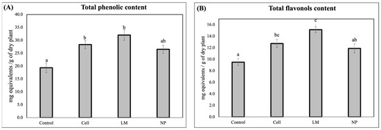 In contrast to the highly specific metabolic remodeling observed in the NP-treated plants, the total phenolic quantification showed no significant differences between the NP and the control, suggesting that the overall pool of phenolic compounds remained relatively stable. However, both cells and LM treatments led to a statistically significant increase in the total phenolic content, reflecting a broader, non-selective stimulation of phenylpropanoid metabolism [6,12]. This observation indicates that while classical biotechnological tools, such as plant cell cultures or metabolic liquids, can upregulate entire pathways, nanoparticle formulations offer the advantage of selective pathway modulation [21,23].