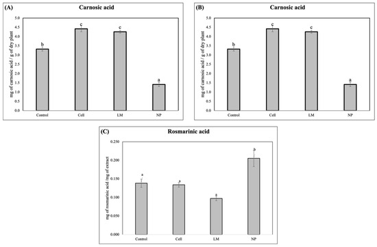 The HPLC analysis revealed a significantly lower concentration of the diterpene, carnosol, in the LM and NP, while a significant increase in rosmarinic acid was detected in the NP treatments (Figure 2).