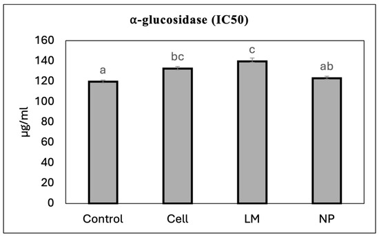 The extracts’ potential to inhibit α-glucosidase activity was calculated as the IC50 value (Figure 3). The cells and LM extracts increased the IC50 value as compared to the controls, therefore achieving worse results than the controls and NPs.