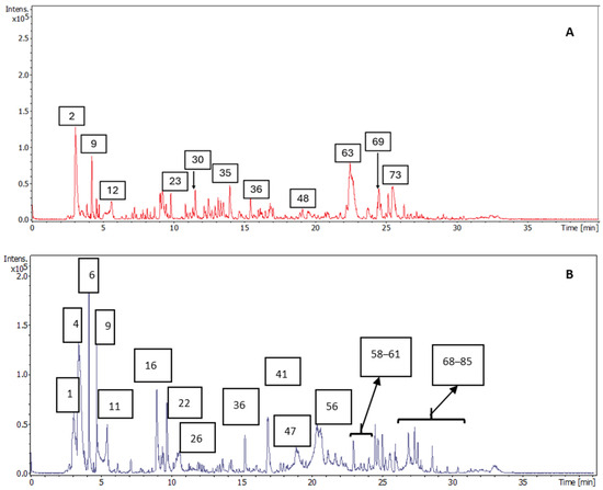 29]. Several flavonoids were also present in both matrices, mainly luteolin (peak 83) and its different glycosylated derivatives (peaks 46, 50, 52, 55, 65). In contrast, apigenin (peak 85) was detected exclusively in olive pomace extracts, as described by Cecchi et al.