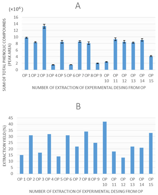 Once all of the experiments were completed, the extraction yield and total peak area of phenolic compounds obtained by HPLC-ESI-QTOF-MS were selected as response variables to evaluate the experimental designs. The values obtained for these response variables are shown in