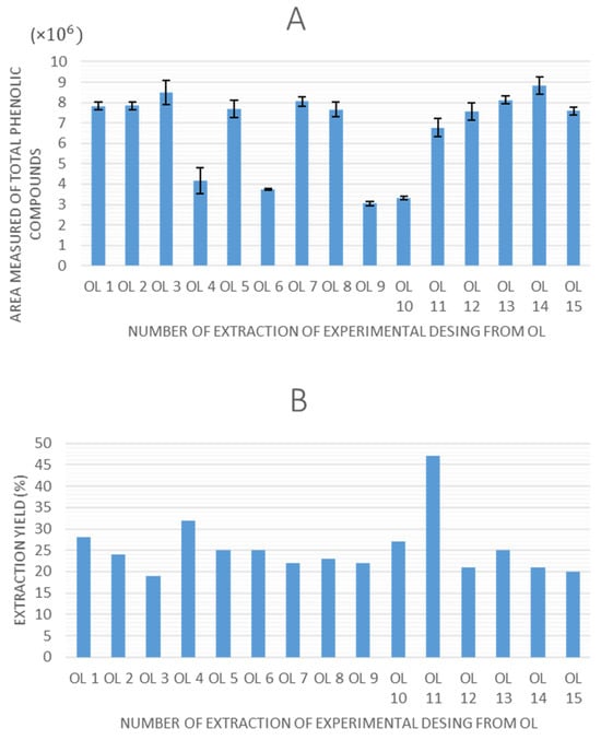 Regarding the graphs illustrating the TPC for each experiment using olive pomace and olive leaves, a consistent trend is observed in both matrices, as follows: extractions performed without ethanol in the solvent system (0% ethanol) resulted in lower quantified areas of total phenolic compounds. This indicates that ethanol is a critical factor influencing extraction efficiency in UAE. Moreover, experimental points 7 (8.6 × 106 in OP, 8.2 × 106 in OL), 14 (9.1 × 106 in OP, 8.6 × 106 in OL), and 15 (8.8 × 106 in OP, 7.8 × 106 in OL), which correspond to the central points of the design, demonstrated high repeatability, confirming the precision and stability of the experimental setup.