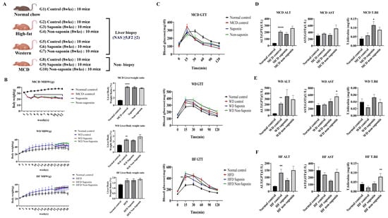 To establish metabolic dysfunction-associated steatotic liver disease (MASLD) models, mice were fed with WD or HFD for 20 weeks to induce fatty liver. The MCD diet was administered for 4 weeks. After diet-induced induction of fatty liver, animals with an NAS ≥ 3 (in HFD and WD models) were selected for further analysis. These mice were then administered saponin or non-saponin fractions for 8 weeks, as outlined in the experimental design (Figure 1A) [].