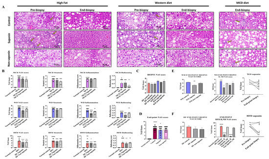 In the Western diet group, the NAS was significantly reduced in the saponin-treated group compared with the control (p = 0.0037) (Figure 2E). Although a decreasing trend in NAS was observed in both saponin and non-saponin treated groups in the High-Fat diet model, the reduction was not statistically significant. However, a comparative analysis of NAS changes revealed a greater reduction in the NAS for the saponin-treated group in the High-Fat diet (3.666 points) compared with that in the Western diet (2 points).